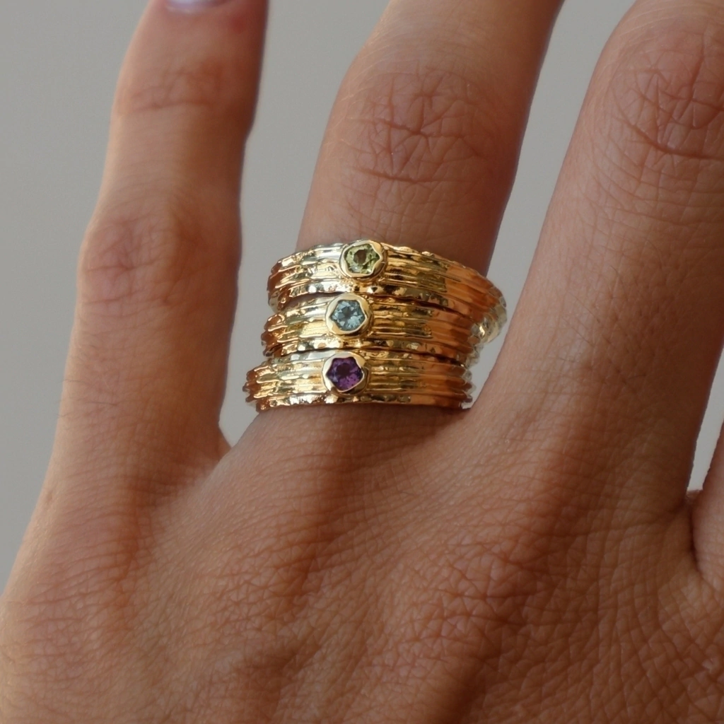 O Anel Aurora expressa renovação, como o próprio significado do nome diz, revela a sensação de um novo começo. Sua espessura propõe delicadeza e elegância, capturando a essência do cacto mandacaru de forma sutil, com uma textura meticulosamente trabalhada, inspirada nos contornos suaves e em padrões intrincados dessa planta do sertão brasileiro.