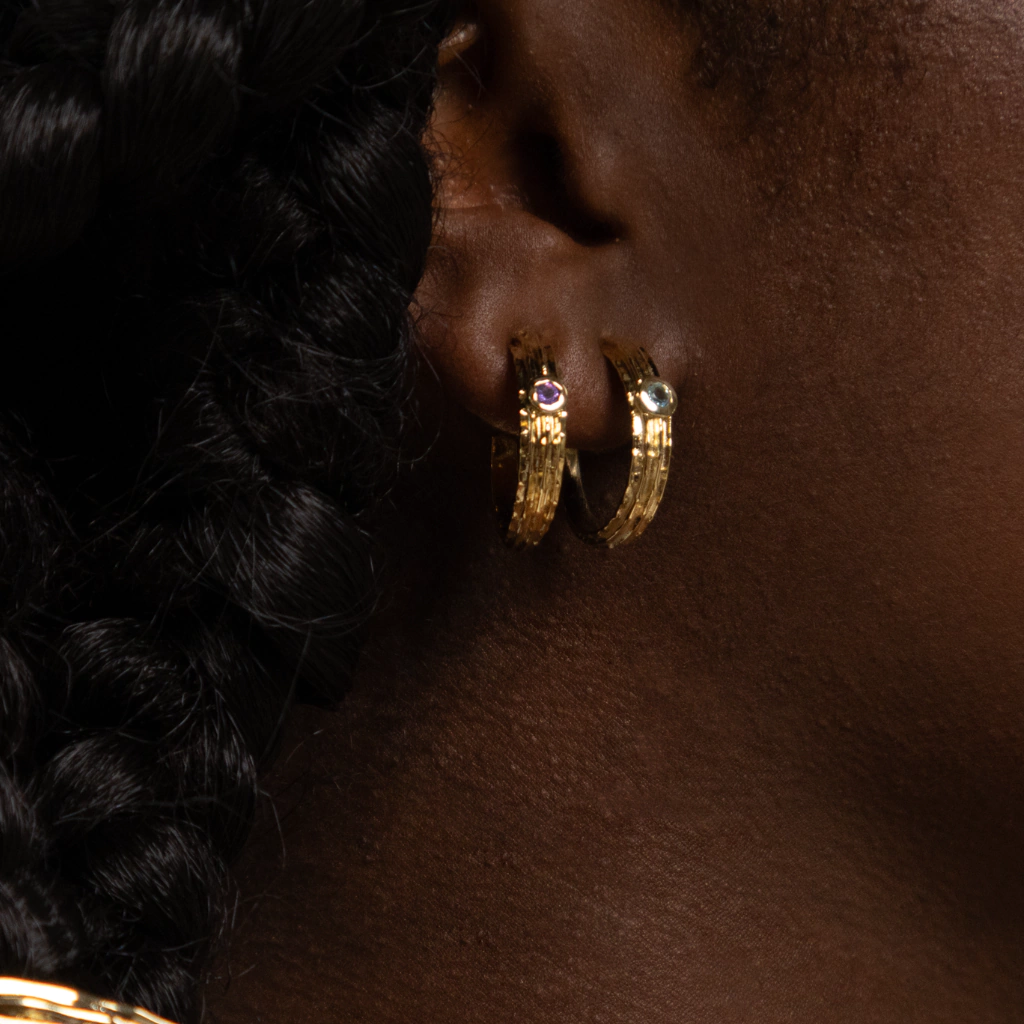 Argola Aurora é uma celebração da dualidade entre a textura rústica, que reproduz os contornos e a superfície do mandacaru, com a delicadeza da pedra preciosa no centro do brinco. Pensada para honrar a natureza e a força, resistência e vitalidade que esse cacto icônico representa.