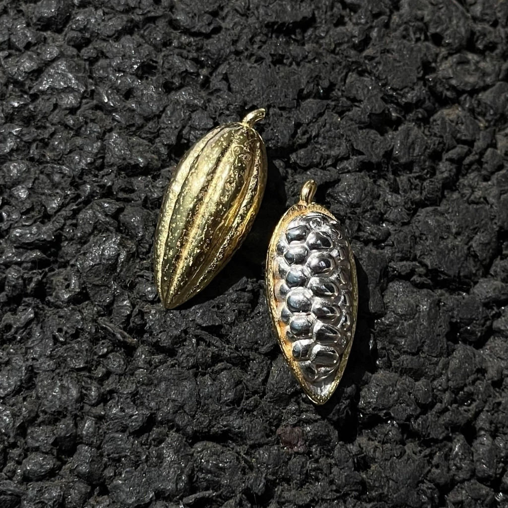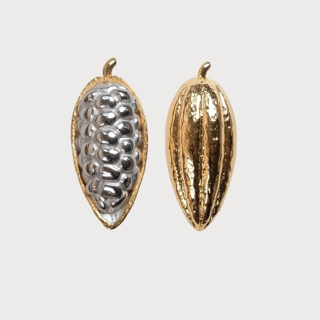 O brinco Aura expressa a dualidade e a força contidas em sua essência. De um lado, o design traz a delicadeza das sementes do cacau, representando a fertilidade, o renascimento e a riqueza desse presente da natureza. Do outro, a textura da casca simboliza a proteção, a origem e a força ancestral que envolve e nutre o interior.