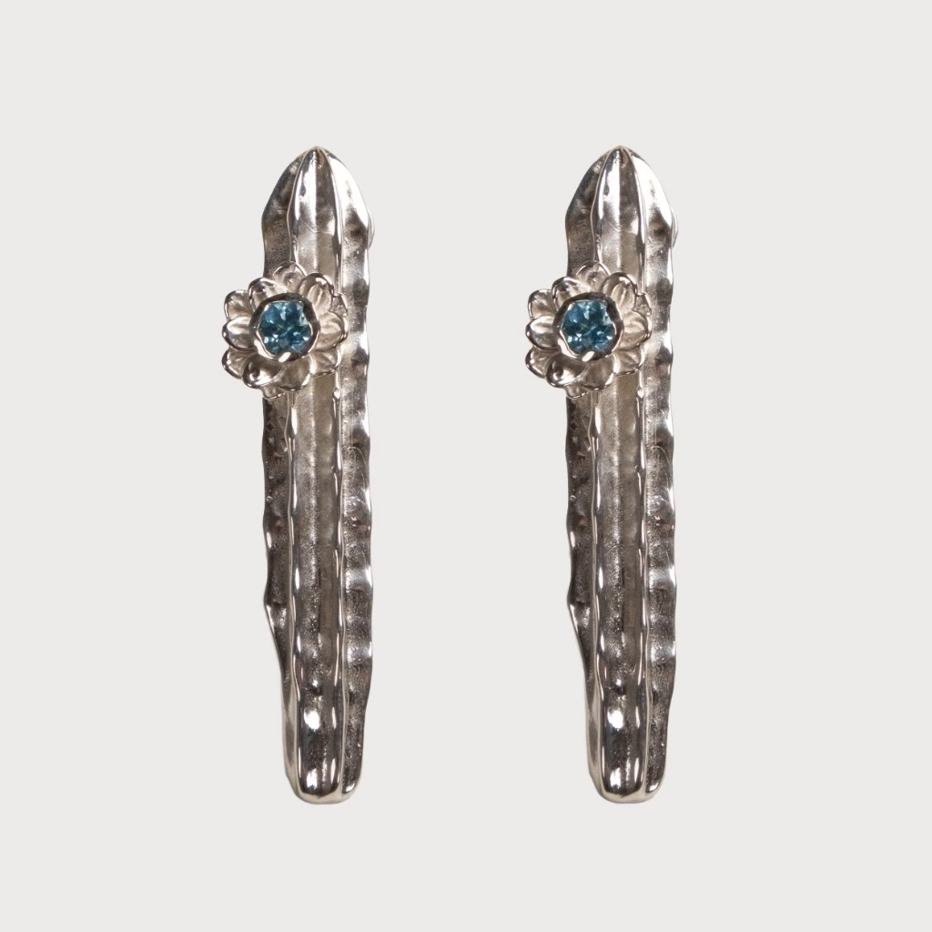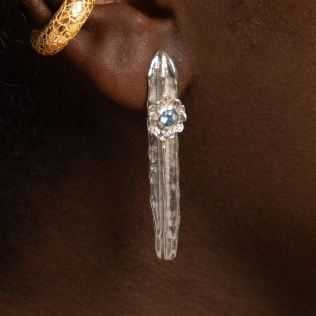 O brinco Sertão foi projetado para capturar a presença imponente do mandacaru no sertão. Esculpido em detalhes intrincados, com diferentes tipos de polimentos, apresenta contornos característicos do cacto, incluindo seus espinhos e segmentos suculentos. A flor dama-da-noite representada sutilmente com suas pétalas e pedra preciosa cravada ao centro, acrescenta uma sensação de magia e encantamento ao brinco. Robusto e imponente, a dualidade entre as plantas oferece um contraste fascinante entre dia e noite, delicadeza e rusticidade, magnetismo e proteção.