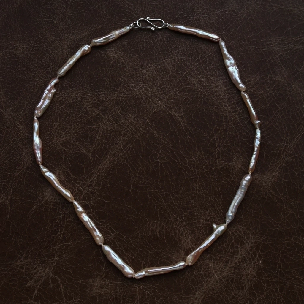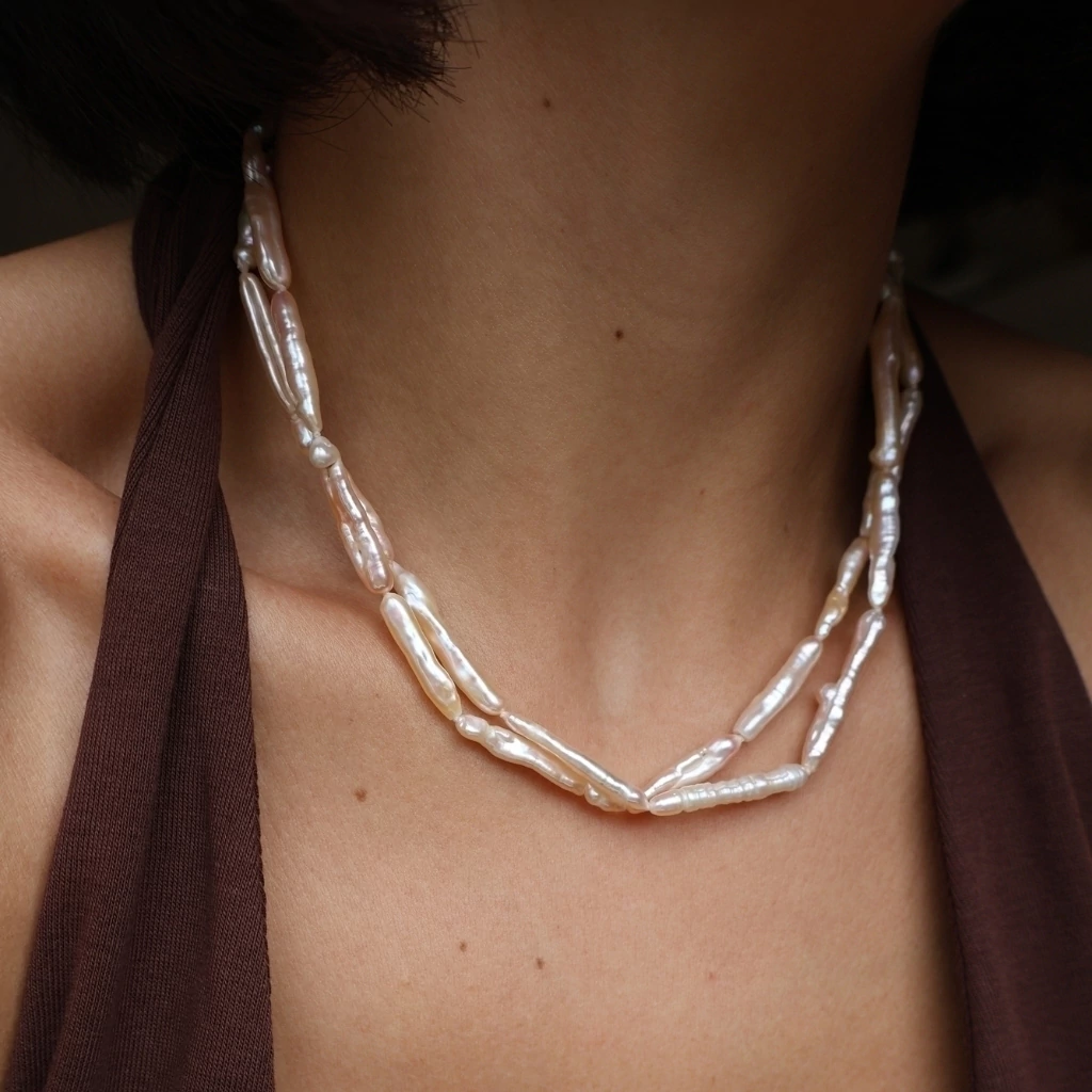 A pérola barroca rosè é uma pequena escultura da natureza, irrepetível, tornando cada colar único.