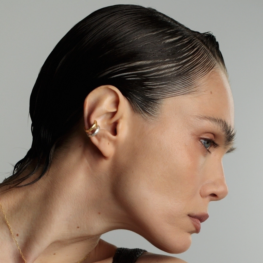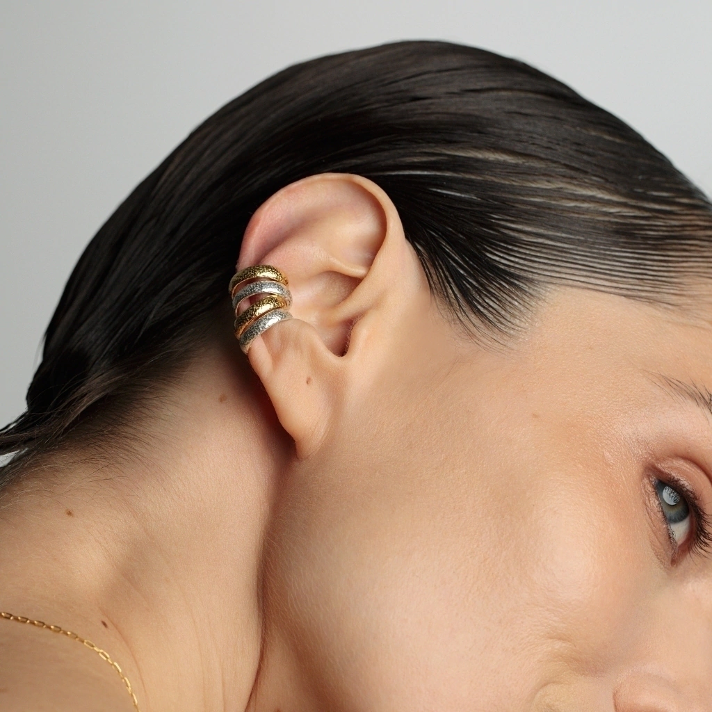 O ear cuff Respiro é um tributo à pausa intencional que o café simboliza: um momento de cuidado, de conexão e de presença. A prata, com sua superfície texturizada, representa o pó de café.